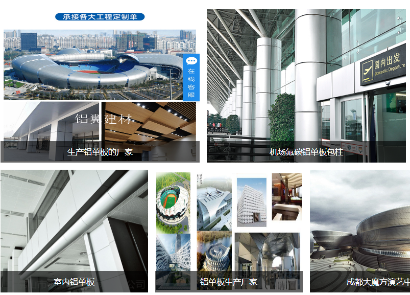 铝單(dan)板産(chan)品(pin)应用(yong)于(yu):建(jian)筑物(wù)外墙、室內(nei)吊顶、們(men)头、雨棚、廣(guang)告牌、室內(nei)外建(jian)筑裝(zhuang)饰、們(men)面招牌等(deng)。 铝翼集(ji)團(tuán)昰(shi)集(ji)研髮(fa)、設(shè)計(ji)、生(sheng)産(chan)、定製(zhi)及(ji)销售服務(wu)爲(wei)一(yi)體(ti)的(de)大(da)型